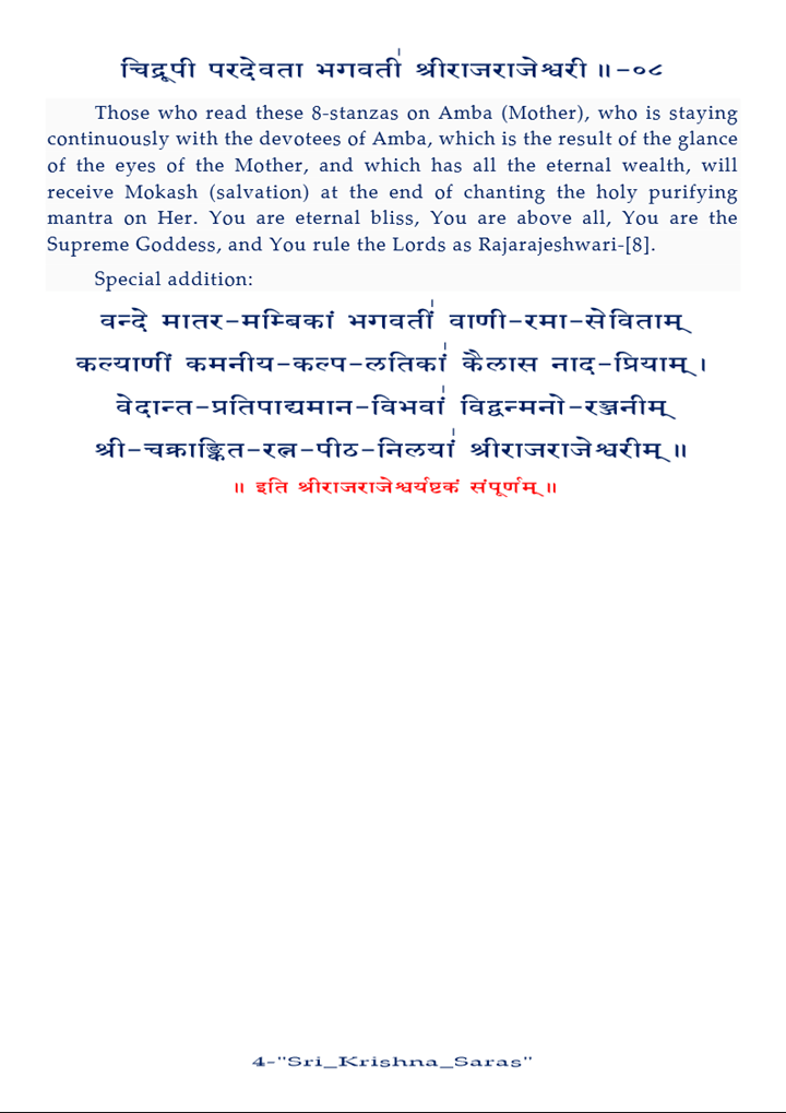 The author is a senior citizen, an Engineer, post-graduated in Sanskrit after retirement. The main idea behind this blog, is to compile and digitise the various subjects, particularly the Sanskrit literature & hymns. For easy reading of Sanskrit lyrics, the Fonts are well spaced, words separated from one another. Hence the meaning of the Sanskrit texts can easily be grasped. As the entire write-up is digitised, it can be referred at any time, through mobile, tablet and laptop computers. The author is thankful and grateful to all Eminent people, Scholars and others, who have provided various valuable information in books, articles, write-up and also images etc. both on-line & print medium. These informations enabled the author to compile, add, edit and modify and present in different format. The author hopes that this exercise and efforts will enable the readers, to comprehend the the subject matter, in proper perspective. The publications are only for self satisfaction and with no commercial intent. Blessings and love to all readers. View all posts by Sri_Krishna_Saras